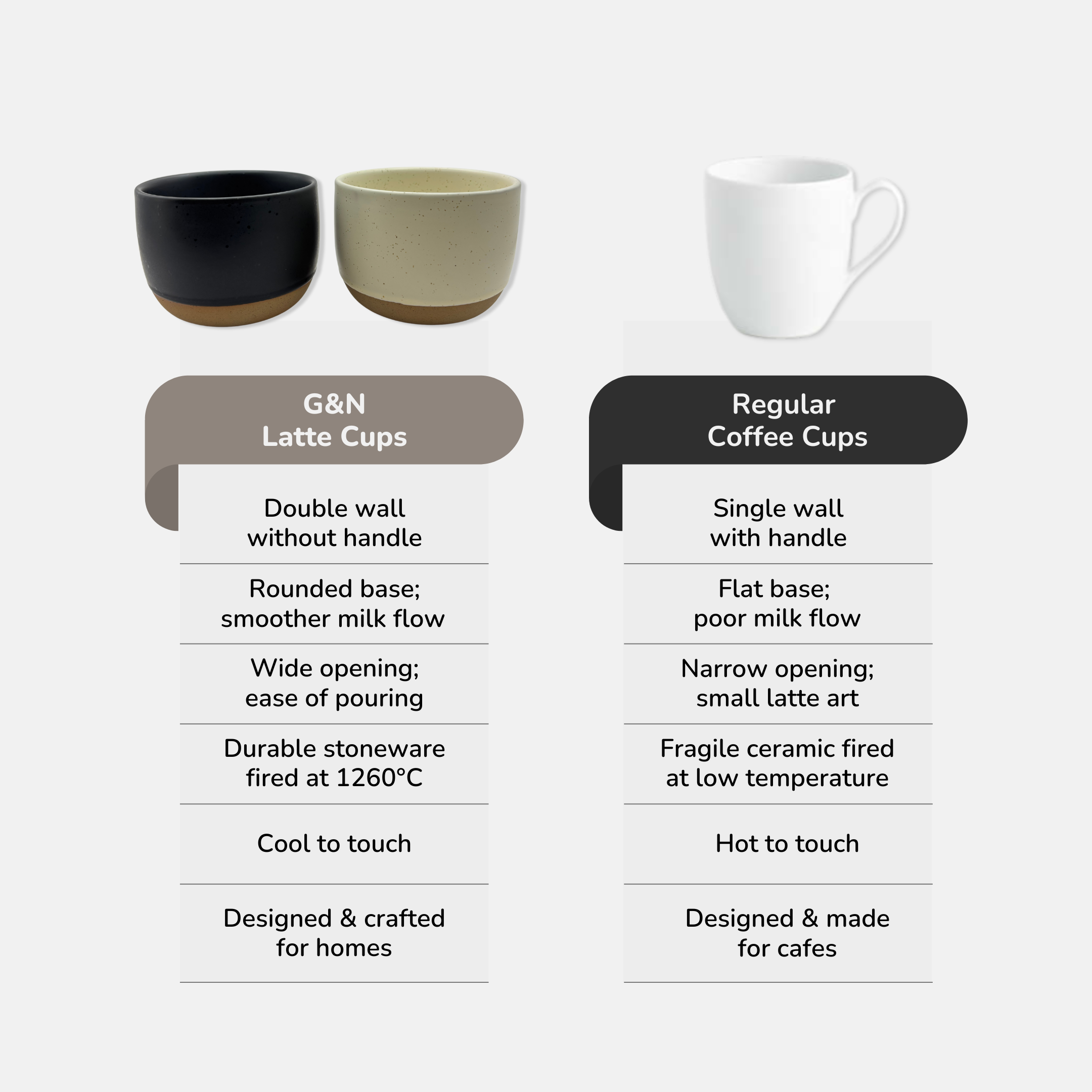 After several failed latte art attempts, we learnt that a rounded base cup is key as it allows milk to flow better, improving the appearance of latte art.
